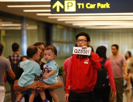 当地时间2014年12月28日,新加坡首都新加坡,樟宜机场员工手举提示标语,引导家属进入等候区。