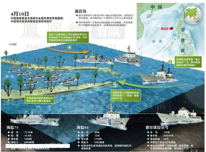 2012年4月10日,菲律宾海军企图在南海黄岩岛附近抓扣中国渔民,被中国海监船制止,双方随后发生对峙。截至2012年5月10日,中菲黄岩岛对峙已满一个月。 黄岩岛,位于北纬15°07′,东经117°51′,距菲律宾苏比克港约100海里。黄岩岛是中国固有领土,黄岩岛海域是中国渔民的传统渔场。