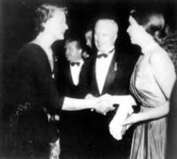 1952年12月,卓别林和乌娜在晚餐会上与英格丽·褒曼互致问候。