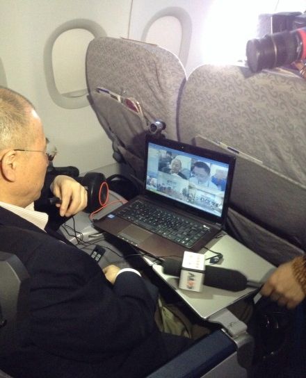 【空地四方会议】我们的空中四方视频会议已经正式开始了!在我们乘坐的CA4109航班上的同事,正在和北京AOC、西南AOC一起轮流向CA4116航班上的领导汇报工作!画面流畅,声音清晰,还是在万米高空!什么感觉?就是这个feel倍儿爽!和领导坐在同一航班上的国航官微小编,看到我们了吗?