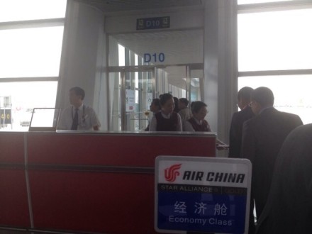 参与国航互联网航班体验飞行的人员即将登机,此次参与体验的受邀明星是筷子兄弟,他们将在对飞航班隔空欢唱,图为主航班的@肖央。工作人员正进行上机前媒体沟通。