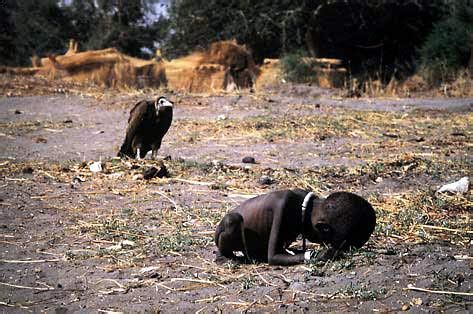 南非摄影记者凯文·卡特来到战乱的苏丹拍摄饥民的情况,走进灌木丛,他看到一个小女孩艰难地向食品发放中心爬来。他蹲下准备拍照时,一只大秃鹫落在女孩背后。
