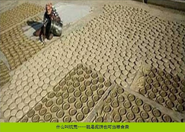 饼干是我们的零食,可泥做的饼却是饥民的主食 \n什么叫饥荒----就是泥饼也可当粮食卖