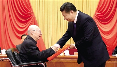 上午,中共中央总书记、国家主席、中央军委主席习近平向获得2014年度国家最高科学技术奖的中科院院士、中国工程物理研究院高级科学顾问于敏颁发奖励证书。