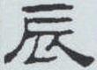 “辰”是“振” 和 “震”字的初文。借指大辰星。《说文》: “辰,震也。三月阳气动,雷电振,民农时也。”商代农民用蜃壳(蛤蚌贝壳)作镰刀,在蜃壳背部穿孔扎绳缚在拇指上,用来掐断禾穗。“辰”字的甲骨文正象蚌镰缚于手指的形状。蜃壳本应呈圆弧形,因甲骨文是用刀刻笔画的,转折不便,故作方折。如同甲骨文刻 “日” 字成方不成圆一样。金文不仅将蜃壳画圆,且加 “手” 或“趾”表示动词。此字经《秦简》至小篆已无象形字特征。隶书以平直的笔画彻底改变了古字形而成为今文。后以 “辰” 作声符衍生出 “䟴、振、 震” 等字。