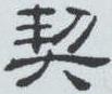 ” 。 中间一 “丨 ”表示去掉枝杈和根须的木, 三斜划表示刻痕。 “丯”加 “刀”成 “㓞” 。 《说文》: “㓞, 巧也。从刀, 丯声。 ” 因“丯”是在木上刻画,所以又加 “木” 成 “栔” 。《说文》: “栔,刻也。”又因最初的卜辞甲文,印信节符都是用刀刻画的,所以又把重要文书、案卷都称作“契” , 如地契, 卖身契等。 小篆分别写作“
