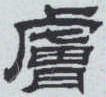 ” , 上边是“虎” 的省文“虍” ,表示老虎; 中间是酒器“卣” ,后字形讹变为“由” ; 下边是“肉”(月)。“由” 和 “肉” 后来成为“胃”变异。合起来表示: 老虎吃人或动物时因为“胃”是内脏,第一口咬到的只是皮肤。籀文只是将虎头放大,字形结构与金文1-2无别。金文3属后期金文,装饰性很强。将虎头中间分开,将下边的内脏省为“甘” 。小篆1和《三体石经》随籀文结构写作“