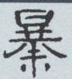 “𣋴”字上边是“鹿”下边是 “火” 和 “日” , 描绘鹿群在火热的太阳下狂奔,以此表示狂暴。汉隶书( 《曹全碑》 )将小篆的弧笔圆折改为直笔方折,从而成为今文。今简化字统一写作 “暴” 。